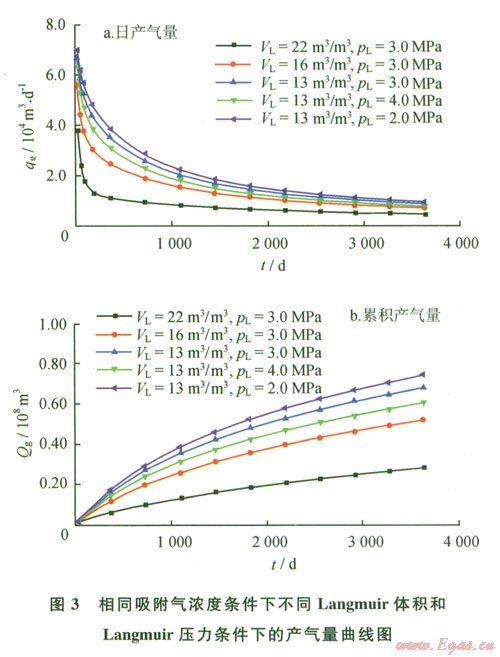 圖3給出了相同吸附氣濃度和開發(fā)條件下,不同Langmuir體積(VL)和Langmuir壓力(pL)對(duì)應(yīng)的日產(chǎn)氣量和累積產(chǎn)氣量。吸附氣濃度相同時(shí),隨Langmuir體積和Langmuir壓力增加,頁巖氣水平井初始產(chǎn)氣量和相同開發(fā)時(shí)間累積產(chǎn)氣量逐漸降低,產(chǎn)量遞減速度加快。吸附氣濃度相同時(shí),Langmuir壓力和Langmuir體積直接影響吸附氣開始解吸附的條件。