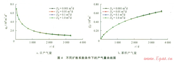 圖4給出了不同級(jí)別擴(kuò)散系數(shù)條件下頁巖氣水平井的日產(chǎn)氣量和累積產(chǎn)氣量曲線,由圖4可知:氣體擴(kuò)散系數(shù)由