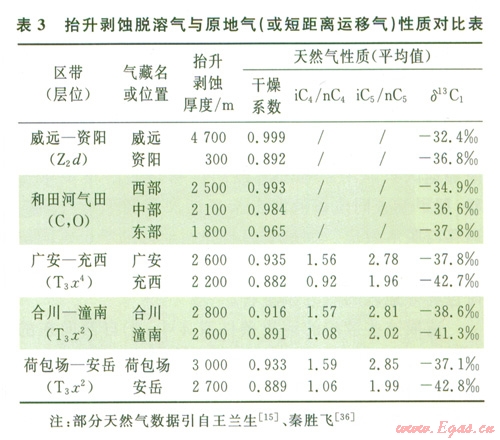 喜山期地層強(qiáng)烈抬升與剝蝕并產(chǎn)生水溶氣的脫溶作用進(jìn)而形成大氣田的實(shí)例,在國(guó)內(nèi)外都有發(fā)現(xiàn)。如西西伯利亞盆地上白堊統(tǒng)烏連戈伊氣田[31-32]、四川盆地威遠(yuǎn)震旦系氣田[14-15]、四川盆地中部須家河組氣田[33-34]、塔里木盆地和田河氣田[10,35-36]等。這種水溶氣脫溶作用形成的天然氣田,其地質(zhì)效應(yīng)主要表現(xiàn)在天然氣組分變化與碳同位素值的變化上。具體而言,其主要地質(zhì)現(xiàn)象是氣藏底部或側(cè)翼水體巨大(或圈閉大而充滿度低),產(chǎn)生的地質(zhì)效應(yīng)是甲烷含量高(或干燥系數(shù)大)、異構(gòu)烷烴增加、富集重碳同位素、存在側(cè)向運(yùn)移效應(yīng)等。