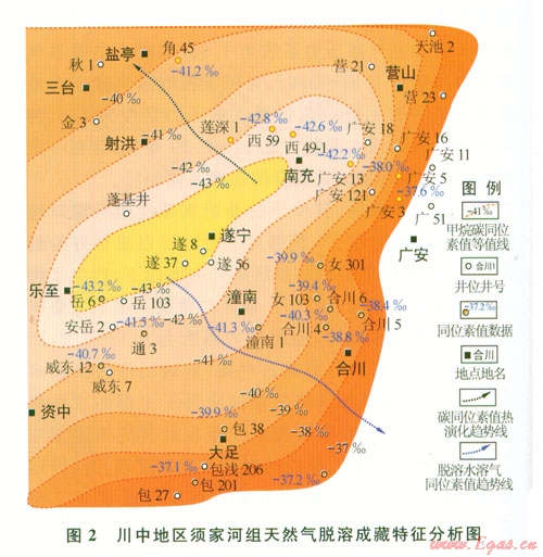 四川盆地中部地區(qū)須家河組地層中水溶氣脫溶聚集與側(cè)向運(yùn)移的現(xiàn)象也很明顯。該區(qū)在廣安、合川、安岳等地探明天然氣地質(zhì)儲(chǔ)量超過4 000×