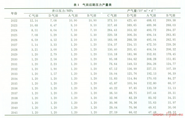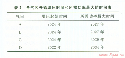 各氣區(qū)后期壓力產(chǎn)量見表1,增壓時(shí)間和所需功率最大時(shí)間見表2。根據(jù)表l、2對(duì)兩個(gè)增壓方案進(jìn)行詳細(xì)論證比選。