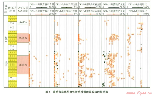 鶯歌海盆地淺高溫碳酸鹽膠結(jié)物與熱流體活動(dòng)有關(guān),東方1-1,樂(lè)東15-1淺中層膠結(jié)物示,含鐵白云石和含鐵方解石的形成溫度間,這些高溫礦物可產(chǎn)出在1