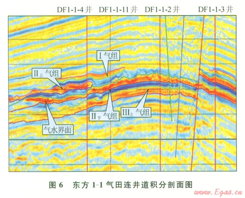 東方l-l鶯二段氣層在地震剖面上具明顯的低頻強(qiáng)振幅特征,原因是高沉積速率的砂泥巖,壓實(shí)和成巖作用弱,兩者間密度速度差別很小,砂巖含氣后,速度和密度都大大降低,產(chǎn)生強(qiáng)波阻抗差,形成亮點(diǎn)和AV0異常;高頻吸收明顯,并在氣層較厚、產(chǎn)狀較陡時(shí)具平點(diǎn)特征(圖6),這種現(xiàn)象在鶯歌海盆地非常普遍,是識(shí)別淺層氣層的重要手段之一。