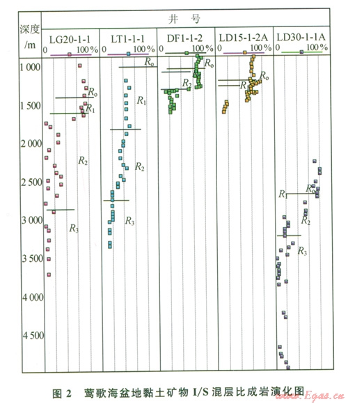 超高溫中央底辟帶的東南區(qū)黏土礦物以綠泥石、伊利石為主;東方區(qū)、樂(lè)東區(qū)雖然以伊/蒙混層、伊利石為主,但在熱流體活躍層段出現(xiàn)高嶺石、綠泥石含量異常,如東方區(qū)和樂(lè)東區(qū)l 500 m上下出現(xiàn)高嶺石含量增高、綠泥石含量降低異常層段,這是由于大量的C02隨著熱流體從深部向上運(yùn)移,在中淺層聚集,并溶于水中,碳酸根含量增加,隨后碳酸釋放出H十,使地層水呈酸性,促使綠泥石向高嶺石轉(zhuǎn)化的結(jié)果。另外在熱流體作用下,出現(xiàn)蒙脫石向伊利石轉(zhuǎn)化突變異?,F(xiàn)象,如靠近斷裂的DFl-1-2井(圖3)在1 200~1