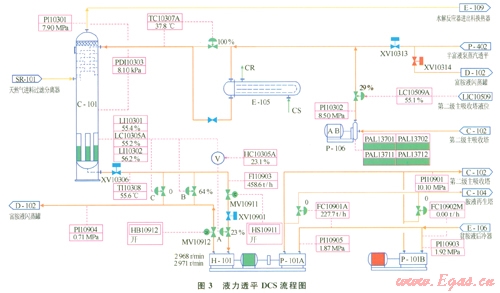 液力透平位于脫硫單元一級(jí)主吸收塔C-101的下游,富胺液自一級(jí)吸收塔底出來后進(jìn)人液力透平膨脹做功,所產(chǎn)生的動(dòng)能用以驅(qū)動(dòng)貧胺液泵,做功后的低壓富胺液送至閃蒸罐。液力透平的DCS流程如圖3所示。