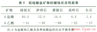 有學(xué)者研究了鹽酸與各種鋁硅酸鹽礦物的反應(yīng)動(dòng)力學(xué),并將反應(yīng)速度常數(shù)的對數(shù)值為50時(shí)對應(yīng)的溫度(T50)作為各種鋁硅酸鹽在鹽酸中保持穩(wěn)定的溫度上限,各種鋁硅酸鹽的T50值如表5所示。表5同時(shí)也給出了根據(jù)熱力學(xué)數(shù)據(jù)計(jì)算出來的鹽酸與醋酸與各種鋁硅酸鹽礦物反應(yīng)的平衡常數(shù)。可以看出,在熱力學(xué)上,這些鋁硅酸鹽均可以溶于鹽酸,但幾乎完全不溶于醋酸;而在動(dòng)力學(xué)上,沸石在鹽酸中最不穩(wěn)定,綠泥石次之,長石最穩(wěn)定。在儲(chǔ)層中占優(yōu)勢的鋁硅酸鹽礦物的T50低于儲(chǔ)層溫度時(shí),應(yīng)該考慮在酸化液中用乙酸代替鹽酸[6-8]。