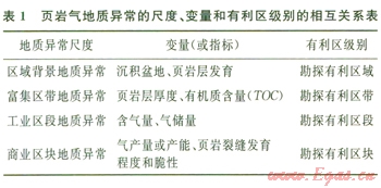 地質(zhì)異常找礦理論和方法是基于對(duì)“致礦地質(zhì)異?!钡纳钊胙芯浚瑢?duì)包括非傳統(tǒng)礦產(chǎn)資源在內(nèi)的各類礦產(chǎn)資源進(jìn)行預(yù)測(cè)的有效理論和方法[l8],其在非傳統(tǒng)金屬礦床的勘探中已經(jīng)取得了很大成功[19-22]。對(duì)于頁巖氣這種非傳統(tǒng)油氣資源,地質(zhì)異常找礦理論與方法也具有廣闊的應(yīng)用前景。筆者基于頁巖氣地質(zhì)異常理論框架研究成果,根據(jù)頁巖氣的特殊地質(zhì)條件,將頁巖氣藏的地質(zhì)異常序列區(qū)分為區(qū)域背景地質(zhì)異常、富集區(qū)帶地質(zhì)異常、潛在工業(yè)區(qū)段地質(zhì)異常和商業(yè)區(qū)塊地質(zhì)異常4個(gè)層次:①區(qū)域背景地質(zhì)異常主要指標(biāo)包括沉積盆地和頁巖發(fā)育;②頁巖氣富集區(qū)帶地質(zhì)異常主要指標(biāo)包括頁巖厚度和總有機(jī)碳含量(TOC);③頁巖氣潛在工業(yè)區(qū)段地質(zhì)異常的主要指標(biāo)包括氣含量和氣儲(chǔ)量;④頁巖氣商業(yè)區(qū)塊地質(zhì)異常的主要指標(biāo)包括頁巖氣產(chǎn)量、產(chǎn)能、頁巖的裂縫發(fā)育程度和脆性。這4個(gè)層次的異常分別是頁巖氣勘探有利區(qū)域、頁巖氣勘探有利區(qū)帶、頁巖氣勘探有利區(qū)段和頁巖氣有利區(qū)塊等4個(gè)不同有利級(jí)別預(yù)測(cè)區(qū)圈定的依據(jù)。頁巖氣地質(zhì)異常的尺度、變量、有利區(qū)級(jí)別的相互關(guān)系可概括為表l。