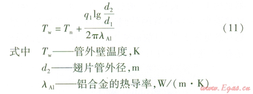 利用通過(guò)圓筒壁的導(dǎo)熱公式,計(jì)算沒(méi)有翅片部分管外壁的溫度Tw,此溫度即為翅片的根部溫度。