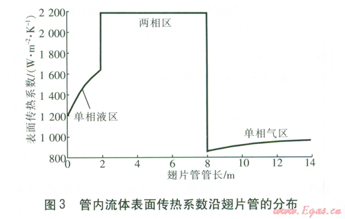 管外壁溫度在單相液區(qū)急劇升高,到達(dá)兩相區(qū)后有一個(gè)突降,而后保持不變,到達(dá)缺液區(qū)后逐漸升高,在單相氣區(qū)也是緩慢升高。由管外壁溫度沿翅片管的分布可以看出,在單相液區(qū)和兩相區(qū)的核態(tài)沸騰區(qū),即從人口至管長(zhǎng)大約6m處,管外壁溫度較低,容易發(fā)生結(jié)露或結(jié)霜現(xiàn)象。