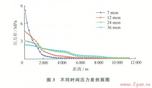 根據(jù)數(shù)值模擬軟件運算結(jié)果,繪制典型剖面壓力分布圖,當(dāng)注入7個月后井底壓力達到28 MPa,壓力逐漸向外為擴散,若假設(shè)不注條件下,由于南區(qū)和長北合作區(qū)壓力差的存在,壓力波也會隨時間的延長向外擴散。用以上兩個壓力剖面相減,即可得到壓力剖面上注采過程中不同距離與壓力差之間的關(guān)系(圖3)。設(shè)置可以觀察的基準壓力值,即可得到不同注采周期下,壓力波的傳播距離在1、2、3年的注氣周期下壓力波傳播距離分別為4. km、6.1 km和7.6 km。
