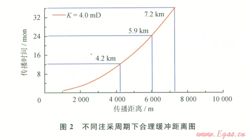 基于理論圖版的可靠性,取南區(qū)與長北邊界處儲層滲透率為4.0 mD時(榆林南區(qū)試井解釋及巖性分析平均滲透率),在不同的儲氣庫注采周期條件下,得到了緩沖區(qū)合理設(shè)置距離。在1、2、3年注采周期下,壓力影響半徑分別為4.2 km、5.9 km和7.2 km,這即為合理的緩沖距離(圖2)。