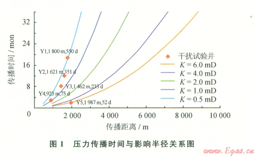 根據(jù)影響半徑計算公式,取榆林南儲氣庫建設(shè)區(qū)儲層孔隙度為0.06,天然氣黏度為0.02 mPa·s,綜合壓縮系數(shù)為0.02 MPa-1,分別對滲透率為0.5~6.0mD等不同條件下傳播時問與壓力影響半徑進行計算,繪制壓力傳播時間與距離關(guān)系圖版(圖1)。