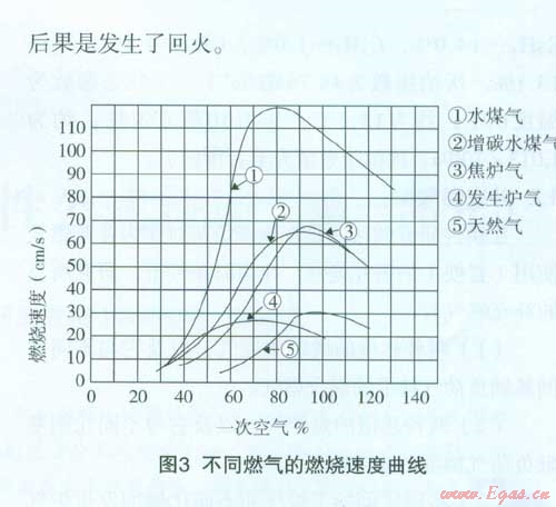 圖3所示為不同燃?xì)獾闹鹚俣扰c一次空氣百分?jǐn)?shù)的關(guān)系曲線,如與單一氣體的曲線相比可看出其火焰?zhèn)鞑ニ俣鹊淖畲笾迪喈?dāng)接近,但并不發(fā)生在相同的一次空氣百分?jǐn)?shù)值時(shí)。假設(shè)一個(gè)使用天然氣的燃燒器按一次空氣系數(shù)為65%調(diào)定(由圖3可知,曲線所示的著火速度約為9cm/s),然后改燒熱值為l400Btu/cf(52.16MJ/m3)的丁烷一空氣混合氣,則一次空氣百分?jǐn)?shù)很快上升到80%,火焰?zhèn)鞑ニ俣冗_(dá)到29cm/s[5],后果是發(fā)生了回火。