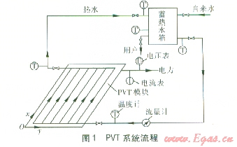 PVT系統(tǒng)實(shí)驗(yàn)流程見(jiàn)圖l,設(shè)置溫度計(jì)、流量計(jì)、電流表、電壓表,測(cè)量各測(cè)點(diǎn)的溫度、水的流量及計(jì)算PVT模塊的發(fā)電功率。實(shí)驗(yàn)臺(tái)布置見(jiàn)圖4。