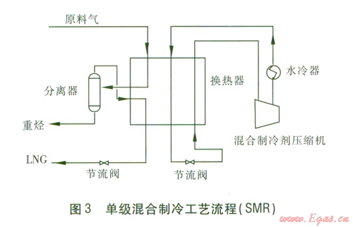 ①單級(jí)混合制冷工藝流程(簡(jiǎn)稱(chēng)SMR)。原料氣通過(guò)冷箱中的換熱器,與混合制冷劑換熱,天然氣被冷卻液化。混合制冷劑先依次經(jīng)壓縮機(jī)增壓、冷卻器冷卻,然后不進(jìn)行氣液分離、直接進(jìn)入換熱器預(yù)冷,再出換熱器節(jié)流降壓降溫,再回到換熱器,與天然氣換熱使之液化,同時(shí)自身氣化成氣態(tài)混合制冷劑,返回壓縮機(jī)。單級(jí)混合制冷工藝流程見(jiàn)圖3。