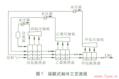 級(jí)聯(lián)式制冷工藝主要應(yīng)用于基本負(fù)荷型天然氣液化裝置。級(jí)聯(lián)式制冷工藝流程通常由三級(jí)獨(dú)立的制冷循環(huán)組成。第一級(jí)丙烷制冷循環(huán)為天然氣、乙烯和甲烷提供冷量;第二級(jí)乙烯制冷循環(huán)為天然氣和甲烷提供冷量;第三級(jí)甲烷制冷循環(huán)為天然氣提供冷量,天然氣的溫度逐步降低直至液化。第一級(jí)采用丙烷作制冷劑,經(jīng)過(guò)凈化后的原料氣在丙烷換熱器中冷卻到-35~-40℃后進(jìn)入第二級(jí)冷卻。由丙烷換熱器中蒸發(fā)出來(lái)的丙烷氣體經(jīng)壓縮機(jī)增壓,水冷器冷卻后重新液化,并循環(huán)到丙烷換熱器。第二級(jí)采用乙烯或乙烷作制冷劑,原料氣在第二級(jí)中被換熱到-80~-l00℃,并被液化后進(jìn)入第三級(jí)冷卻,由乙烯換熱器中蒸發(fā)出來(lái)的乙烯氣體經(jīng)壓縮機(jī)增壓,水冷器冷卻后,在丙烷換熱器中冷卻重新液化,并循環(huán)到乙烯換熱器。第三級(jí)采用甲烷作制冷劑,液化天然氣在甲烷換熱器中被過(guò)冷到-l50~-163℃,然后通過(guò)節(jié)流閥降壓后,輸送到LNG儲(chǔ)罐儲(chǔ)存。甲烷換熱器中蒸發(fā)出來(lái)的氣體經(jīng)增壓、水冷后,在丙烷換熱器中冷卻、在乙烯換熱器中液化后,循環(huán)到甲烷換熱器。