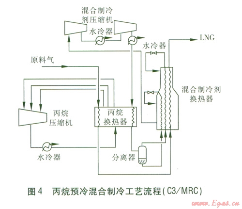②丙烷預(yù)冷混合制冷工藝流程(簡(jiǎn)稱(chēng)C3/MRC)。天然氣先經(jīng)過(guò)丙烷預(yù)冷,然后用混合制冷劑進(jìn)一步冷卻并液化。低壓混合制冷劑經(jīng)兩級(jí)壓縮機(jī)壓縮后,先用水冷卻,然后流經(jīng)丙烷換熱器進(jìn)一步降溫至約