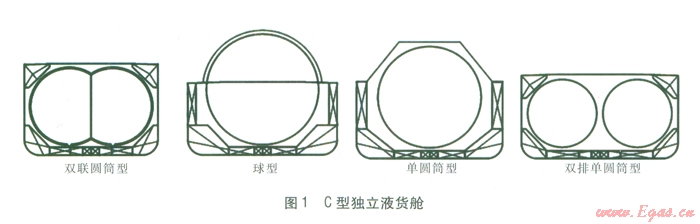 對于圖l所示的幾種C型獨(dú)立液貨艙,在貨物滿載時,球型和單圓筒型液貨艙的重心比雙聯(lián)圓筒型液貨艙高,故降低了船的穩(wěn)性,且由于球型和單圓筒型液貨艙直徑大,部分體積凸出主甲板以上,故增加了受風(fēng)面積,不利于操縱。就船體主甲板以下的艙容利用率而言,雙聯(lián)圓筒型液貨艙最高,單圓筒型液貨艙次之,雙排單圓筒型液貨艙最差。在同樣的船體主尺寸下,如采用雙排單圓筒型液貨艙,需要增加船寬以滿足布置要求。