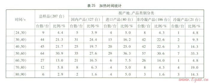 由表25,我們可以得出以下結(jié)論:全部樣品加熱時(shí)間分布范圍為24~90 s,其中在30~60 s范圍分布比例較大,冷凝產(chǎn)品、非冷凝產(chǎn)品、國(guó)內(nèi)產(chǎn)品與進(jìn)口產(chǎn)品分布趨勢(shì)與總樣品趨勢(shì)相同。