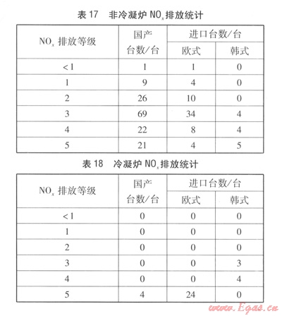 表16中,l級(jí)最差,5級(jí)最好。非冷凝爐N0x排放統(tǒng)計(jì)見(jiàn)表l7,冷凝爐N0x排放統(tǒng)計(jì)見(jiàn)表1 8。