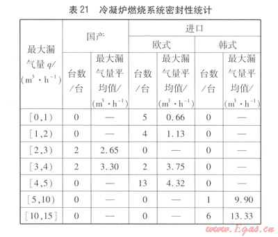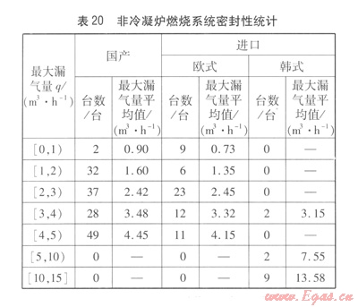 非冷凝爐燃燒系統(tǒng)密封性統(tǒng)計(jì)見(jiàn)表20,冷凝爐燃燒系統(tǒng)密封性統(tǒng)汁見(jiàn)表21。