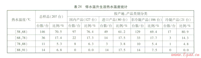 由表24,我們可以得出以下結(jié)論:全部樣品停水溫升溫度分布范圍為58~91℃,其中在58~78℃范圍分布比例較大。冷凝產(chǎn)品、非冷凝產(chǎn)品、國(guó)內(nèi)產(chǎn)品與進(jìn)口產(chǎn)品分布趨勢(shì)與總樣品趨勢(shì)相同。