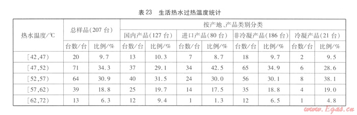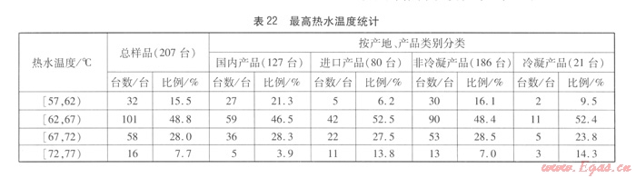 由表22,我們可以得出以下結(jié)論:全部樣品最高熱水溫度分布范圍為57~77℃,其中在62~72℃范圍分布比例較大。冷凝產(chǎn)品和非冷凝產(chǎn)品在62~