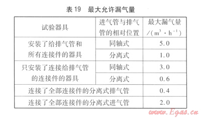 GB 25034-2010標(biāo)準(zhǔn)的第6.2.2條規(guī)定了燃燒系統(tǒng)密封性,在規(guī)定的試驗(yàn)條件下,器具給、排氣系統(tǒng)泄漏量應(yīng)小于表19的規(guī)定值。