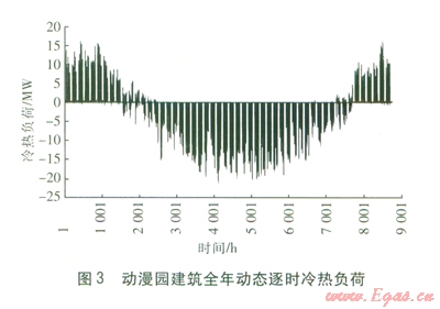 采用Energyplus模擬計算動漫園建筑全年動態(tài)逐時冷熱電負荷。全年動態(tài)逐時冷熱負荷見圖3,圖中正值為熱負荷,負值為冷負荷。由圖3可知,全年最大冷負荷為20 532.8 kW,最大熱負荷為15 987.3kW。建筑全年各時段用電負荷(不含空調(diào)系統(tǒng)用電負荷)比較均衡,全年最大用電負荷為6 883.5 kW。