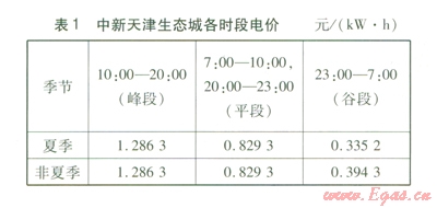 燃氣價格按照2.4 元/m3計算,中新天津生態(tài)城各時段電價見表l。此外,燃氣輪機部分負荷率下降到0.5以下時熱效率下降嚴重,因此將燃氣輪機部分負荷率≥0.5作為約束條件。將以上參數(shù)輸入到優(yōu)化評價模型就可得到聯(lián)供系統(tǒng)的最優(yōu)設(shè)備配置和運行策略。