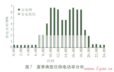 在動漫園實行峰谷電價的基礎(chǔ)上,冬夏季典型日聯(lián)供系統(tǒng)的供熱量、供冷量、供電功率的分布見圖4~7。由于在優(yōu)化模型中考慮了設(shè)備負荷率等實際因素的影響,因此對于根據(jù)優(yōu)化結(jié)果進行配置的方案,圖4~7即可反映全年典型目的各個設(shè)備啟停狀態(tài),即優(yōu)化配置方案下的運行策略。