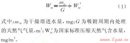 根據(jù)上述已知條件計(jì)算可得,在吸附周期(處理天然氣,使其含水量符合國家標(biāo)準(zhǔn)的連續(xù)工作時間)內(nèi),干燥塔最多可吸附45kg的水(分子篩動態(tài)吸附量為靜態(tài)吸附量的10%)。由式(1)可得,改造前工藝來氣含水量908mg/m3,改造后工藝來氣含水量53mg/m3。