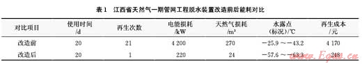 脫水裝置再生工藝流程由雙塔開式循環(huán)改造為單塔閉式減壓循環(huán)后,解決了由于再生飽和濕氣與工藝來氣存在交匯點(diǎn),致使冷凝出的水合物大量積聚在前置過濾器中,導(dǎo)致工藝來氣在進(jìn)入到吸附塔前含水量陡增的問題。改造后的脫水裝置較改造前吸附能力顯著提升,再生頻率大幅降低。與此同時,減少了再生過程中天然氣和電能的損耗,節(jié)能效果較為顯著。以目前江西省天然氣一期管網(wǎng)工程加氣母站年產(chǎn)量計(jì)算,每年可節(jié)省約10×104元的生產(chǎn)成本(表1)。