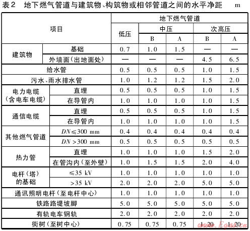 城鎮(zhèn)燃氣管道壓力分級及地下燃氣管道與建筑物、構筑物或相鄰管道之間水平凈距分別見表1,表2。