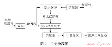 2) 熱水循環(huán)系統(tǒng)。熱水循環(huán)系統(tǒng)的主要設備是熱水鍋爐、熱水泵、電子水處理器、除污器等,負責向 CNG 減壓釋放裝置中的換熱設備提供循環(huán)熱水以保證系統(tǒng)的正常工作。調壓后的煤層氣作為熱水鍋爐的燃料。
