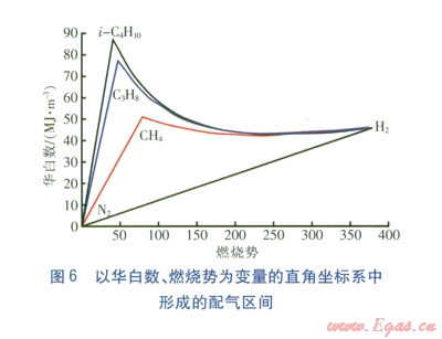 基于互換性原理進行的試驗氣配制,一般將甲烷、H2、N2三組分、丙(丁)烷、H2、N2三組分作為原料氣,控制試驗氣的華白數(shù)、燃燒勢、黃焰指數(shù)等關鍵燃燒特性指數(shù)與基準氣相等,并進行以華白數(shù)、燃燒勢為主要控制指標的配制設計[7],建立配制試驗氣的整體分布區(qū)間。以CH4、H2、N2三組分,C3H8、H2、N2三組分,n-C4H10、H2、N2三組分,i-C4H10、H2、N2三組分為原料氣,在以華白數(shù)、燃燒勢為變量的直角坐標系中形成的配氣區(qū)間見圖6。由圖6可知,各組原料氣形成的配氣區(qū)間邊界線并不全為直線,任兩種可燃氣體形成的配氣邊界線為指數(shù)曲線,而N2與H2、N2與另一種烷烴可燃氣體形成的配氣邊界線為直線。