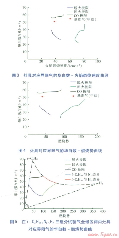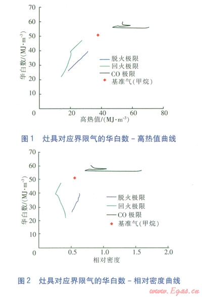 為了確定表征燃具適應性的燃燒特性指數(shù),課題組建立了試驗裝置,選擇大氣式燃具(主要為家用燃氣灶具,包括嵌入式灶、臺式灶),進行了燃燒工況測試。分別測量灶具在脫火、回火、C0超標時的燃氣組成,由此計算各極限情況下的燃燒特性指數(shù)。并根據(jù)華白數(shù)、高熱值、相對密度、火焰燃燒速度、燃燒勢等關鍵指數(shù),繪制試驗數(shù)據(jù)圖形(直角坐標系),確定表征燃具適應性的燃燒特性指數(shù)。