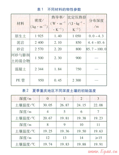 為了使數(shù)值計算結(jié)果更接近實際,考慮了土壤豎直方向的分層現(xiàn)象,根據(jù)重慶地區(qū)的現(xiàn)場勘測結(jié)果,沿土壤豎直方向依次為原生土、泥巖、砂巖。對于水平地埋管換熱器,回填材料為原生土。豎直地埋管換熱器鉆孔的回填材料為河砂與膨潤土的混合物。對于樁基螺旋地埋管換熱器,樁基內(nèi)部為混凝土,外部為原生土。不同材料的物性參數(shù)見表l。由表l中原生土、泥巖、砂巖的分布深度可知,水平、樁基螺旋地埋管換熱器所在深度只涉及原生土,豎直地埋管換熱器所在深度涉及原生土、泥巖、砂巖。