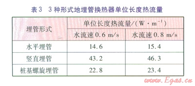 由于采取定入口水溫,不同形式地埋管換熱器單位長度(對于豎直地埋管換熱器為單位鉆孔長度)熱流量不同(見表3)。由表3可知,在運行時間內(nèi),3種地埋管換熱器中豎直埋管換熱器的單位長度熱流量最大。樁基螺旋地埋管換熱器的單位長度熱流量高于水平地埋管換熱器,但樁基螺旋地埋管換熱器的出口水溫在運行后期上升較快,可以推斷,隨著運行時間的進一步延長,這兩種地埋管換熱器單位長度熱流量的差距會逐漸縮小。