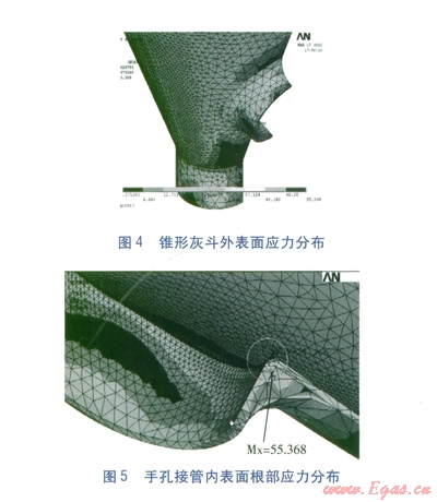ANSYS提供了變形、應(yīng)力、應(yīng)變、能量等云圖顯示。錐形灰斗外表面應(yīng)力分布見圖4。手孔接管內(nèi)表面根部應(yīng)力分布見圖5。由圖4、5可知,最大當(dāng)量應(yīng)力位于手孔接管內(nèi)側(cè)的圓角過渡處,在設(shè)計壓力為0.28MPa時,最大當(dāng)量應(yīng)力為55.37MPa。