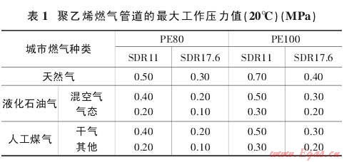 1.2.2 在聚乙烯燃?xì)夤艿赖膲毫υO(shè)計中,還需要考慮到燃?xì)庵兴姆枷銦N類物質(zhì)所產(chǎn)生的影響,以及管道的施工條件等因素,根據(jù)國家相關(guān)的行業(yè)標(biāo)準(zhǔn),聚乙烯燃?xì)夤艿涝试S的最大工作壓力如表1。