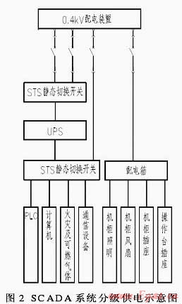 從圖1可見,SCADA系統(tǒng)正常情況下由UPS供電,在UPS設(shè)備故障時由變電所直接供電。該系統(tǒng)的設(shè)計考慮多級冗余,一是UPS進(jìn)線冗余設(shè)置,二是在線式UPS本身具有旁路功能,即正常情況下一路經(jīng)濾波整流直接輸出,故障情況下另一路由后備電池經(jīng)逆變器后輸出,三是一路變電所低壓電作為UPS的備用。以上供電系統(tǒng)多級冗余設(shè)計時需設(shè)置STS靜態(tài)切換開關(guān)。