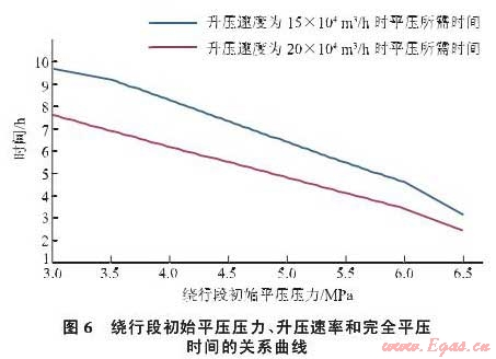 按照15萬(wàn)m3/h20萬(wàn)m3/h的升壓速率,從繞行段整體升壓至3MPa開(kāi)始,計(jì)算完全平壓所需要的時(shí)間,得出繞行段初始?jí)毫?、升壓速率和時(shí)間之間的關(guān)系曲線(圖6)。繞行段升壓至4.5MPa后,按照20萬(wàn)m3/h的升壓速率,完全平壓需要5.5h;在繞行段升壓至5.2MPa后,按照15萬(wàn)m3/h的升壓速率,完全平壓需要6h。為確保升壓盡快完成,同時(shí)考慮安全因素和計(jì)算誤差,選擇在繞行段升壓至4.5MPa作為進(jìn)氣平壓點(diǎn)。