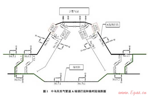 A線繞行段是改變?cè)兄袨跆烊粴夤艿涝O(shè)計(jì)線路向西繞行至烏茲別克斯坦加茲里氣田區(qū)的一項(xiàng)關(guān)鍵性工程,如果不采取非常措施,按期實(shí)現(xiàn)中烏天然氣管道A線單線投產(chǎn)通氣難度極大。為此,采用了通過(guò)臨時(shí)段管道連通A線管道先實(shí)現(xiàn)投產(chǎn),待A線繞行段具備投產(chǎn)條件后,再將其與A線管道連通,最終實(shí)現(xiàn)A線管道投產(chǎn)、臨時(shí)段管道停用的總體方案。
