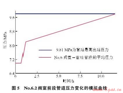 根據(jù)No.6.2閥室前段管道平均壓力8MPa和中烏管道首站進(jìn)口流量600萬(wàn)m3/h的工況進(jìn)行模擬計(jì)算,在首站壓縮機(jī)組不停機(jī)的情況下,No.6.2閥室關(guān)閉約6h后,該閥室上游管道平均壓力達(dá)到9MPa;約11h后,該閥室上游管道平均壓力達(dá)到9.8MPa5)經(jīng)過(guò)計(jì)算得出,約9h后,首站壓縮機(jī)組因出口壓力達(dá)到9.8MPa而停機(jī),進(jìn)而使阿姆河氣田外輸站壓縮機(jī)組停機(jī),影響上游的正常運(yùn)行。為了安全起見(jiàn),可以按No.6.2閥室上游管道平均壓力達(dá)到9MPa時(shí)的6h作為平壓作業(yè)的實(shí)施時(shí)間。