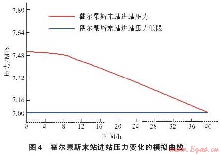 根據(jù)中亞天然氣管道霍爾果斯末站的進(jìn)站壓力7.5MPa和出口流量700萬(wàn)m3/h的工況進(jìn)行模擬計(jì)算,No.8.2閥室關(guān)閉36h后,霍爾果斯末站進(jìn)站壓力降到7.1MPa(圖4),即No.8.2閥室關(guān)閉36h后將影響到下游正常運(yùn)行。