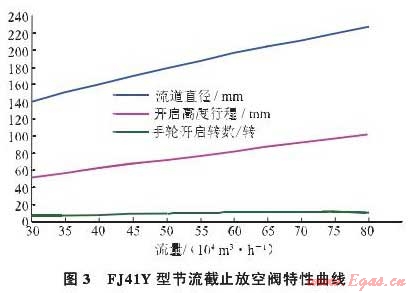 No.6閥室的旁通和放空截止閥均采用FJ41Y-600節(jié)流截止放空閥,根據(jù)廠家提供的該閥滿足流量、壓差的開(kāi)度范圍,模擬壓差為80.2MPa的節(jié)流特性曲線(圖3)。在(3080)萬(wàn)m3/h的流量條件下,FJ41Y型節(jié)流截止閥的流道直徑、開(kāi)啟高度行程、手輪開(kāi)啟的轉(zhuǎn)數(shù)與通過(guò)流量呈線性關(guān)系。當(dāng)手輪開(kāi)啟5.8轉(zhuǎn)時(shí),通過(guò)流量將達(dá)到30萬(wàn)m3/h,遠(yuǎn)遠(yuǎn)超出置換投產(chǎn)期間的控制流量;當(dāng)手輪每開(kāi)啟0.5轉(zhuǎn)時(shí),通過(guò)流量將增加5萬(wàn)m3/h。