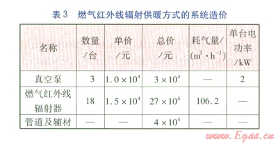 由以上分析可知,在3種供暖方式中,燃?xì)饧t外線輻射供暖方式的系統(tǒng)造價及供暖期運(yùn)行費(fèi)最低。