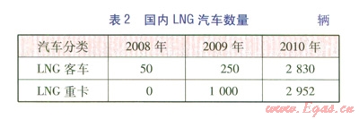 截至2010年,國(guó)內(nèi)有近6 000輛LNG汽車,推廣使用LNG汽車的城市主要有北京、貴陽(yáng)、長(zhǎng)沙、烏魯木齊等,均以LNG公交車為主。表2為近幾年來(lái)我國(guó)LNG汽車的發(fā)展情況[6]。