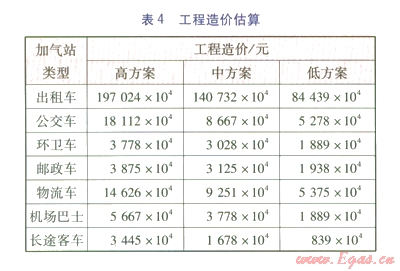 根據(jù)LNG車輛用戶的特點及北京市的實際情況確定加氣站的建設(shè),郵政車、物流車以及50%出租車的加氣站采用與規(guī)劃的加油站建合建站,分別進(jìn)行管理;公交車、環(huán)衛(wèi)車、機(jī)場巴士、長途客車以及50%出租車的加氣站考慮改造有條件的已建加油站進(jìn)行聯(lián)合建站。各方案的工程造價估算見表4